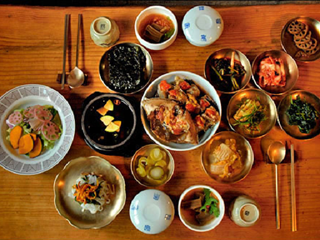 宫廷美食在韩国是比较推崇的,食用宫廷美食比较讲究,我们要用国王的餐桌——“水刺床”。水刺床是比较传统并且高贵的饮食之道。传统的饭床是由3张桌子组成,分别是“圆盘”、“小圆盘”和“册床盘”。以前圆盘是放在国王的正前方,所以现在也要在就餐者的正前方,圆盘上有米饭、汤、炖汤、炖菜、豆腐和其他泡菜等多种小菜。其他两个饭桌上有生鱼片、木碳火锅、烧烤、涮锅子等当天的特别餐点。同时水刺床上备有白米饭和豆饭。有牛杂汤和海带汤为汤点,炖汤主要是酱汤、炖肉和蔬菜等。
