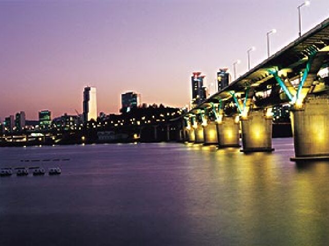 汉江的夜色美在天然,美在纯净。没有铺天盖地的广告牌,没有令人窒息的商业味道,更没有无孔不入唯利是图的商贩。西江大桥、麻浦大桥、元晓大桥,一座桥就是一道彩虹,斑斓多姿,熠熠生辉,而又洁净纯粹,天然质朴。处处精致的细节,无不渗透着韩国人对自己家乡深深的爱恋,触动着你最脆弱的心弦。
