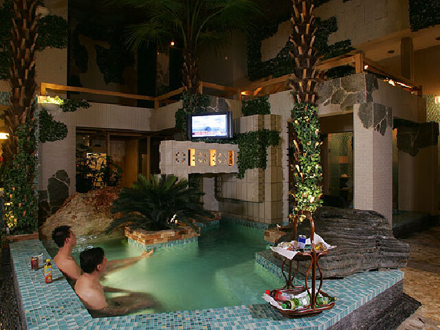 采用传统方式,以散发独特芳香的栎树为炭火原料,是集桑拿、韩式蒸幕、露天浴池、海水浴池、天然盐浴池、游泳池、健身中心等洗浴设施为一体的大型蒸浴房及SPA洗浴中心。主厅在装饰上,采用了仿中国皇宫的设计理念,辉煌华丽,常被作为电视剧或娱乐节目的拍摄背景地使用。 温泉馆内不仅有主活动区、山野休闲区、健身运动训练区、SPA区、桑拿区等多种蒸浴房和SPA设施,还有餐饮区等便利休闲设施,是休闲娱乐的好去处。