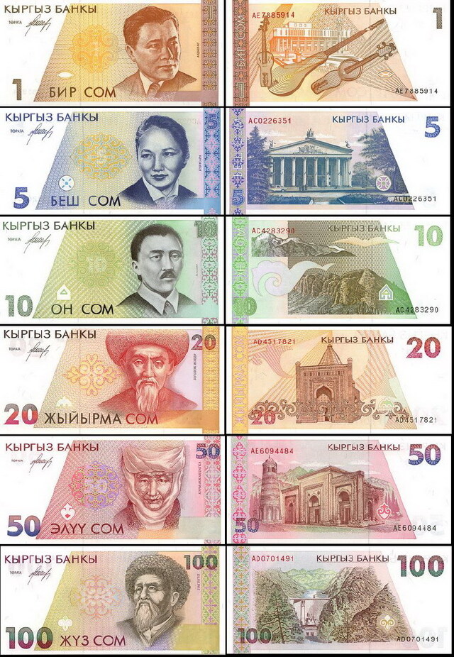 1993年,政府和吉尔吉斯银行分别发行1、10、50和1、5、20索姆纸币。吉尔吉斯银行在1994年发行新一系列面值为1、5、10、20、50和100索姆的纸币,第三套面值分别为1、5、10、20、50、100、200、500和1000索姆的纸币在1997年起发行。 1索姆可分为100提因。