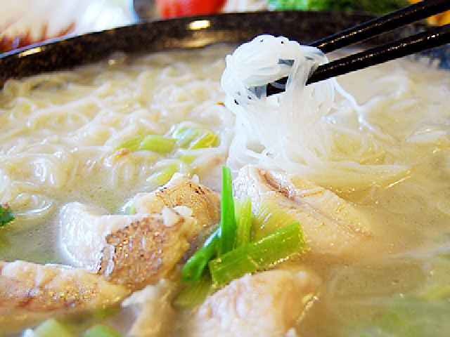 食材:米粉、金目鲈、黄豆、腌水梅、紫菜、腐竹、芋头、生菜等 口感风味:汤汁鲜美、酸爽可口 营养价值:鲈鱼中富含蛋白质、脂肪、钙、磷、铁、铜、维生素等,补气补血、强筋健骨、化痰止咳、安胎等。