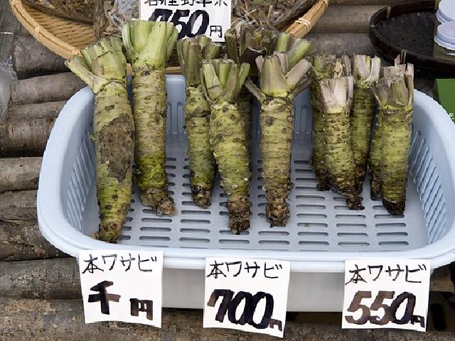 山葵被称为日本芥末,长野县西北部的安昙野山葵田种植面积位居日本第一位。真正山葵实际上以叶子和茎部为主,山葵根具有一定的甜味。在美国或中国几乎所有寿司店,和日本大部分寿司店,都用仿制山葵,因为真正的山葵非常昂贵。