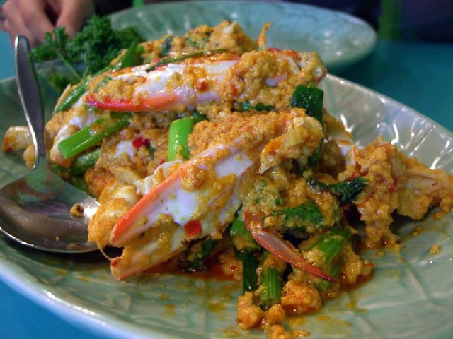 咖喱炒蟹是极受欢迎的泰国名菜,切块的红蟹加上配菜与咖喱和各式香料共炒,突出蟹肉的鲜味与弹性,风味独特。主料为泰国的青木瓜切丝,配料有青豆角、蒜头、虾米、西红柿、椰糖、辣椒等,再加入酸子汁及柠檬汁,整道菜香辣而带酸,口感爽脆,十分开胃。