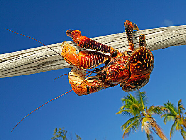 椰子蟹(拉丁文学名:Birgus latro)又称八卦蟹,是十足目陆寄居蟹科的节肢动物。 其体重最高可达6公斤,是现存最大型的陆生节肢动物。有人称椰子蟹为强盗蟹,因为传言它们会从民居和帐篷中偷窃罐和银器之类的东西。它们是一种寄居蟹,能用钳子弄破椰子的外壳,以吃其中的椰子果肉,并因以为其名。