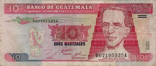 危地马拉流通币种有纸币和硬币,格查尔鸟是危的马拉的国鸟,不能笼养,故称“自由之鸟”,被视为自由、爱国、友谊的象征。 纸币的面值有1、5、10、20、50、100格查尔。 硬币的面值有1、5、10、25分。 其中币种的兑换进位为1格查尔=100分。
