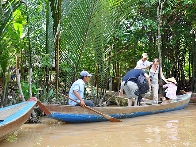 湄公河河面宽阔,河水滚滚.河床边是棕榈等热带的植物.河水很是浑浊,但是它的浑浊并不会让人觉得脏.整个湄公河的景色十分壮观。雄浑的河水,倒影着蔚蓝色的天空。沐浴着东南亚热带阳光,能闻到夹杂了泥腥味的河水气息。在柴油马达的轰鸣声中,木船开始带着在河上穿梭。两岸尽现茂盛的原始雨林,是非常精彩的漂流之旅。