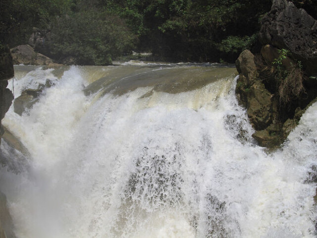银链坠潭瀑布位于天星桥景区水上石林的左上方,在黄果树众多的瀑布群中,它并不是较高的也不是较阔的,但它却是众多瀑布中颇为风情万种的,让人看见就难以忘记,瀑布高10多米,底部是槽状的溶潭,上方呈漏斗形状,谭面上隆起了很多的石包,这些石包像一张张的荷叶长在谭面上,而正是因为这些“荷叶”才让潭中的水犹如银链一样倾泻而下,煞是好看。