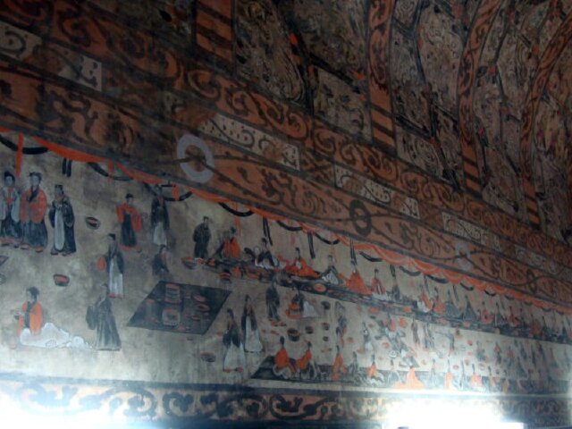 《宴饮百戏图》长七米,高近一米,乃打虎亭汉墓内的巨幅壁画,画面宏大,构图巧妙严谨,线条丰富,却是杂而不乱,色彩艳丽,人物众多,可见当时能人巧匠的精湛技艺。画中的被邀请来宴会的王公贵族们身穿不同颜色图案的服装,或默默坐在席上,或交头接耳,或手舞足蹈,一幅画充分展现了当时贵族们丰富的社会生活。