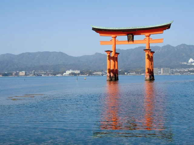 严岛神社前约200米的海中有一座16.6米高的红色大鸟居,是宫岛的标志性景观。当大海涨潮时,被海水半淹着的大鸟居显得神秘而壮观,从严岛神社伸出的舞台“火烧前”来眺望它,景色尤美。待退潮后,更可以直接走到大鸟居的底下去近距离观赏。 黄昏时分,金黄色的天空映照出大鸟居的雄姿,是拍照的最好时机。当然除了等退潮,游船近距离观看也是个不错的选择。