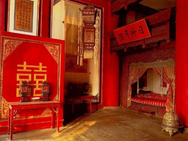 坤宁宫处于北京故宫内,坐北面南,共九间屋子,规模宏大。曾是明朝皇后的寝宫,也是清朝皇帝皇后成亲洞房的婚房和举办重要祭祀活动的地方。宫内装潢精巧华丽,一方面沿袭了明代风格,一方面有不少满族特色。很有特色的是东端二间房,是用于皇帝大婚时的洞房,装饰陈列都十分喜庆,金碧辉煌,墙壁刷红漆,挂双喜宫灯,东西门上刻有金漆双喜字,有出门见喜之意。