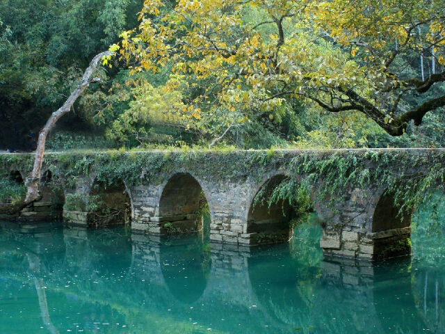 古桥坐落在景区前方,景区之名由此桥而得。这是一座小巧的七孔古石桥,古桥由整齐的麻石条砌成,桥身上爬满了藤蔓和蕨类植物;古色古香的桥下是绿得令来此的游人心醉的涵碧潭。两岸古木参天,无数的虬枝沿着古桥伸长手臂,就如有巨伞撑在桥上,为游人遮风挡雨。又因此桥传说是由七位姑娘捏成的,所以它还有一个传奇的别称叫“七姑桥”。此桥看起来单簿,但几百年来经历了多次洪水冲击却依然耸峙,迄今为止还无缺无损,可见其技术的精妙。