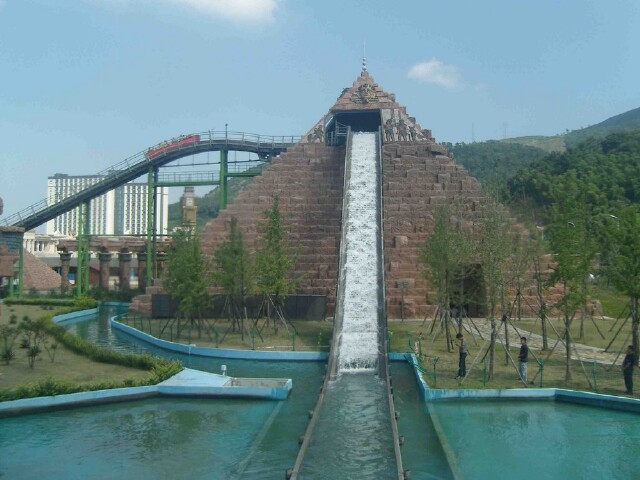 登上古埃及的太阳穿,沿着环绕金字塔的特定的水道缓缓进入金字塔,游客一定会有着非常不同的感觉。随着太阳船慢慢的攀登到金字塔的较高处,越过金字塔顶端,瞬间从高处滑到下面,在惊声尖叫中迎来巨大的浪花,给游客酣畅淋漓的刺激感。