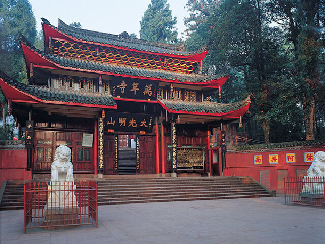 万年寺,四川峨嵋山历史悠久的古刹之一,相传为汉代采药老人蒲公礼佛处;东晋隆安五年(401)创建时名普贤寺;唐乾符三年(876)慧通重建,易名白水寺;宋称白水普贤寺;明万历二十八年(1600)重修时,神宗赐额“圣寿万年寺”,沿称至今;万年寺为峨嵋山八大寺庙之一,全国重点寺院之一,有无梁砖殿、巍峨宝殿、白水池等景点。