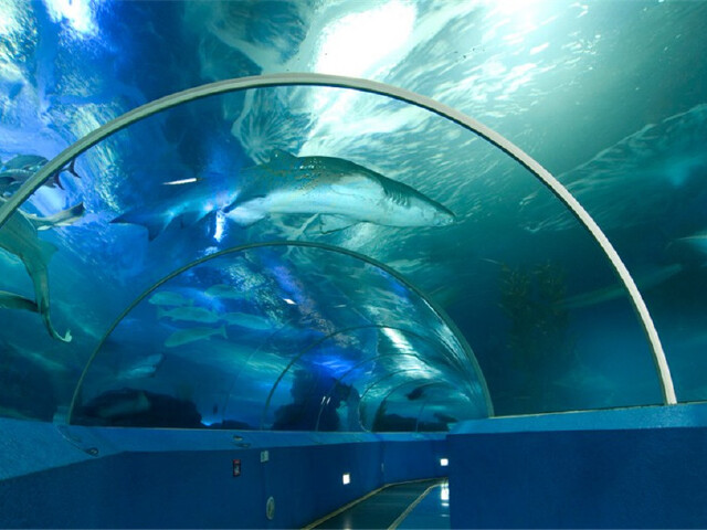 海洋世界里面有一条全亚洲较长的海底观光隧道,它是采用国外进口压轴较大的亚克力的玻璃幕墙制作而成的。360度全方位的展示海洋里的一切,10公分厚的玻璃幕墙里面储存了1500多吨的海水,清晰度却像一公分厚的玻璃,具有非常强的耐水压能力。进入其中游客仿佛来往于奇妙的海底世界,成群的海底生物在这里嬉戏游玩供游客观赏。