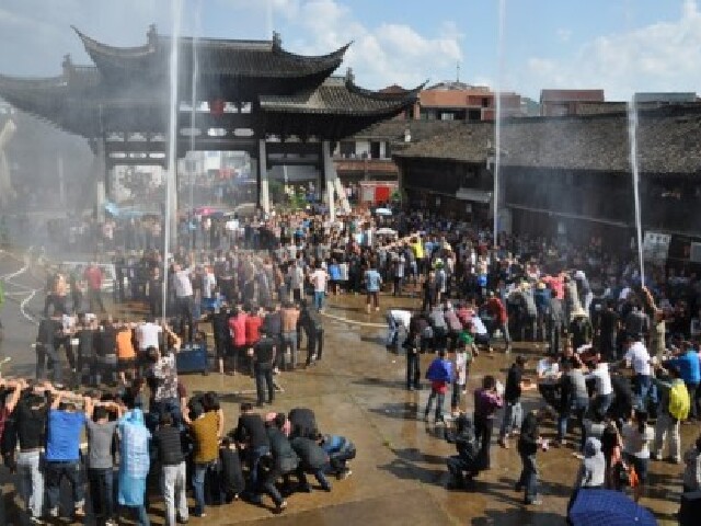 这是古镇同里的一大特色。到了农历六月廿三这一天,四周乡村的人都要赶来看闸水龙,这实际上是一年一度的消防比赛。比赛地点从大庙开始,向西一直排到渡船桥堍,越向西河面越开阔,帮较西的一条消防龙是米业工会的一部用汽车引擎发动的消防车,功力大,射程远,其中则都是人力的,射程一般都不远,但拿龙头的人有时故意将龙头朝天发射,把飘飘洒洒的水珠泼向没带雨伞的人群,弄得看客浑身湿漉漉的,但大家仍嘻嘻哈哈的很是开心。