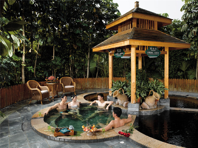 碧水湾温泉度假村是按五星级标准建造的大型露天温泉主题度假村。它四周层峦叠嶂,树木葱郁,碧水环绕。碧水湾温泉日出水量4000余吨,出水口温度高达71摄氏度,含有20多种有益人体微量元素。温泉浴使用古法中医的医理体系,秉承古代皇帝的养生方法,结合现代的温泉养生、达到强身、补血、养颜、固肾的功效。在特定的环境中,度假村为顾客们营造出一种令人心旷神怡的美妙感觉,舒心安神、疏经通脉,身心自然舒展开来。度假村里大型的露天温泉有三十三个,各色温泉泳池、药浴池和戏水池应有尽有,足浴、按摩等服务一应俱全。