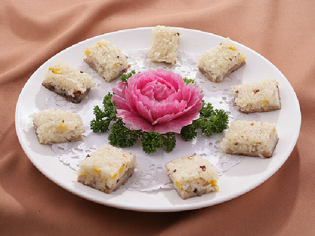 江平芋头糕是东兴特有的点心.其味道酥脆,香气诱人.做法为:先把芋头去皮,切成筷子头大小,过油锅炸熟至脆皮然后起锅;香肠也切成同芋头大小,过油锅.把粘米粉、五香粉、盐、味精等佐料及适量水烧开,然后放在盆中和芋头、香肠拌匀,放在蒸笼上蒸45分钟.蒸熟后切成方形煎干便可
