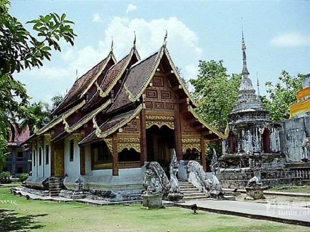 寺院周围苍松翠柏,古木参天,两条用彩色玻璃片和扇形彩釉小瓷砖镶嵌的巨龙,各有大小7个龙头,雄踞石阶两侧,龙首高翘,威风凛凛。长约150多米的龙身随石级起伏而上,一直伸展至佛寺门口。石阶重重叠叠,共309级,十分壮观。