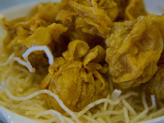 会安著名的美食,酸酸甜甜的口感,非常独特。香脆的云吞皮配上虾仁和各种调料,是一道适合中国人口味的美食。