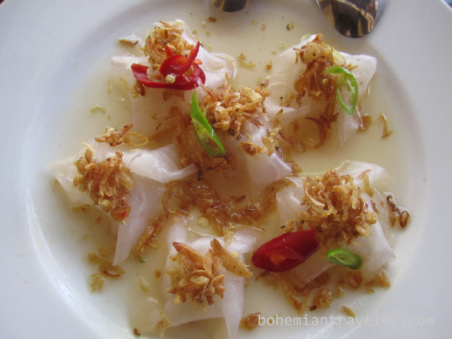 会安的白玫瑰是一道有名的美食,越式春卷皮白糯柔软,包裹鲜美的干虾松,捏成玫瑰花瓣的形状,撒上过油腌制的虾松鱼松,口味非常独特。