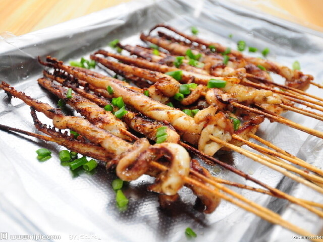 无论是在太原市还是在胡志明市的大街小巷都能常可看到摊贩推着小车,沿街兜售烤鱿鱼 ,这也是太原市小吃的一大特色。小车上有一盆通红的炭火,一旁摆着鲸鱼干。鱿鱼放到炭火上烤得焦黄后再用铁制的压延机技压成又长又大的薄块,然后徐上黄皮酱、辣椒酱等佐料卷起来吃。也有些商贩则是将鱿鱼腿部拆解下来,串成串进行烤制,撒上葱花等佐料,香味四溢。