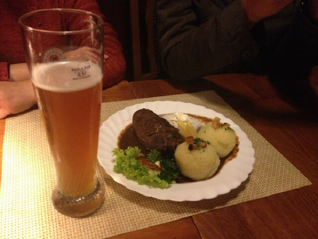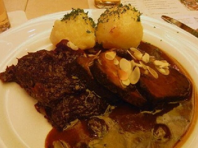 醋焖牛肉是德国一道经典的老菜。因为可以腌制4-5天,很多德国人会在一周的开始,某天有空的晚上腌起来,然后星期天享用。虽然制作的时间需要很长,但是腌制和焖都不用人在一边守着,只要时间安排合理,反而是倒制作简单的菜。用红酒腌制、红酒慢慢焖出来的牛腿或者牛肩肉,带着红酒醋的酸味,配上葡萄干和越橘的酸甜果味。牛肉入口即化,多汁而不腻,汤汁浓稠鲜美,与土豆丸子一起,实在是道非常赞的德国美食。