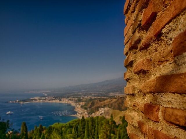 陶尔米纳希腊剧场,它是里岛上的一个度假胜地。塔奥敏纳山城最高处有一“希腊剧院”,是公元前二世纪罗马人所建。世界上最美妙的阳台大概就在西西里岛的陶尔米纳了。这里有一切令人痴狂的元素,悬崖峭壁之巅的古希腊剧场,雾气升腾的欧洲最大活火山,若隐若现的纯白火山口,晶莹剔透的蔚蓝地中海,隐匿在山脊的古老城镇,一望无垠的海天一色。来到这里,似乎,人生也因此得以完美。 西西里岛是一个令人发狂的地方,这个欧洲第一大岛屿像一部深邃的历史教科书,又仿佛一座天然的艺术博物馆,把自然和人文结合得天衣无缝,浑然天成。上帝果真是有私心的,让这里拥有比别处多得多的宝藏。而这些宝藏里最杰出的代表作,就是西西里岛东岸的陶尔米纳(Taormina)。陶尔米纳,也被列入了联合国世界遗产名录。
