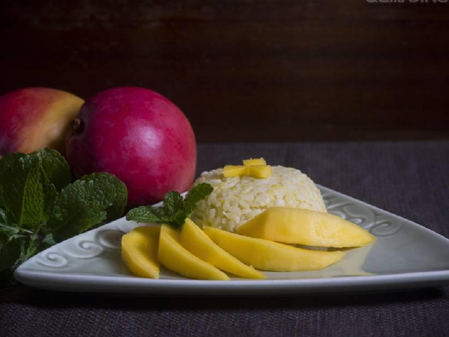 芒果糯米饭是泰国特色的甜品小吃,将芒果整颗切块装入盘中,另一侧放入淋上椰汁的糯米饭,卖相十分简单,可是令人意想不到的是,这么简简单单的组合,竟然能在口里发生神奇的“反应”。芒果是甜中带一点点的酸,这一点点酸,在口中品得分外清晰,就那一瞬间,酸味就被糯米饭的甜味给融化了,可这一瞬间融化的感觉,又是这样丝毫不落地在口中就能品味得到。糯米饭和芒果实在是配合得天衣无缝。