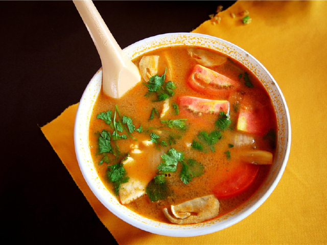冬阴功 ,味道类似酸辣海鲜汤。炎夏里喝上一口,唇舌留香,似乎汤里放了某种特质的香料。 喝不惯的人会觉得口味略重,爱喝的人真的会越喝越喜欢。