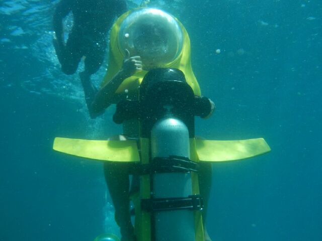 绝对新颖的海底摩托车带有一个密封头盔,带上头盔,驾驶员和乘客便可透过透明的保护空腔舒适地观赏360度海底全景;而且海水只会漫到肩部不用担心呼吸问题。 一次这样的潜水只持续半个多小时,但游客可以在3米深的水下自由驾驶摩托车调节其速度和方向,同时,在驾驶教练不断地安全指导下,游客还可以体会到海底探索的乐趣与刺激。