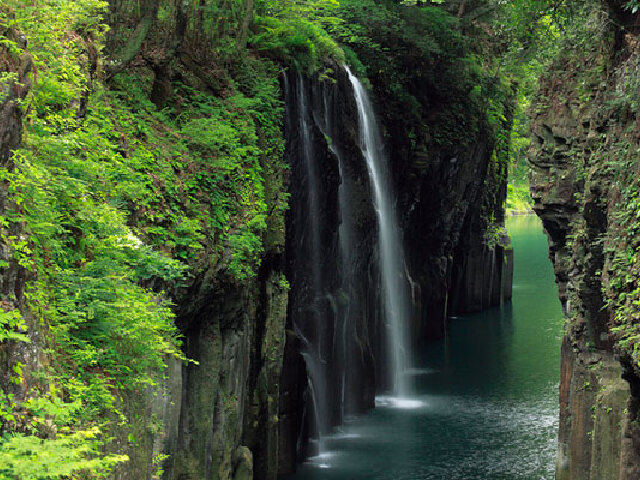 高千穗峡是由阿苏熔岩的侵蚀而形成的高达80米至100米的V字型柱状节理断崖。在高千穗峡上比较著名的另一个景点是17米高的真名井瀑布,周围山青水秀,峡谷内水质清澈,泛舟其中别有一番情调。