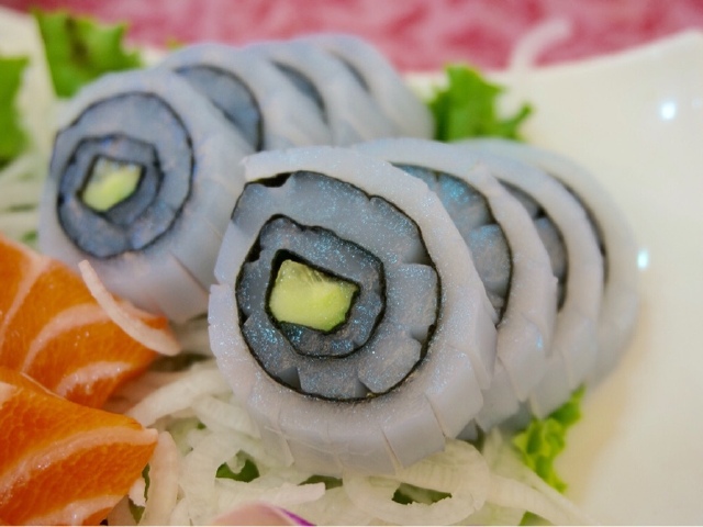 海园把软丝和海苔卷成了像寿司卷一样的形状,最外圈还用刀子划了一刀刀整齐的刀痕,一个个叠在一起看起来颇可爱,吃起来鲜味十足,口感非常地软,几乎跟刚捞上岸的软丝一模一样的新鲜。