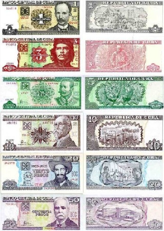 古巴有两种货币,一种是古巴比索,货币代码CUP,在古巴的中国人俗称土比索,主要是古巴人,以及在古生活的外国人如留学生使用,用途也窄得多,一般只能用于购买农产品、在个体餐厅或小吃店买东西、在标价为CUP的商店购物、乘公交车等使用。另一种叫可兑换比索,货币代码CUC,可兑换各种流通货币,在古巴的中国人俗称红比索,类似我国以前的外汇券,可以和外币兑换,外国游客到古巴用的也是这种货币,币值比较高。 纸币的面值有1、3、5、10、20、50、100比索 硬币的面值有1、2、5、20分和1、3、5比索。 其中币种的兑换进位为1元=100分