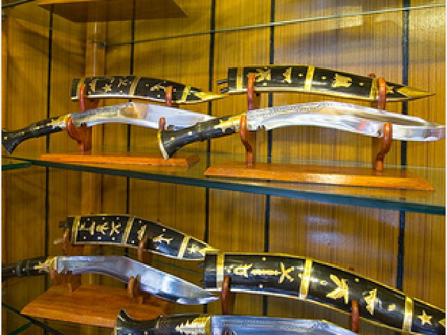 尼泊尔山区的人们身上往往会佩戴弯刀,因为弯刀精致、富有特点,也成尼泊尔的特色商品。廓尔喀刀又称尼泊尔军刀,是尼泊尔的国刀,在尼泊尔到处都能买到,价钱决定于刀刃和刀套的镶嵌饰物和手工,刀套镶嵌纯银的刀价格很高,不过非常美丽高贵。真正的弯刀,刀身底部有很小的V形凹痕,此外,刀套背面还有两把小刀。