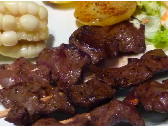 Anticuchos烤牛心是利马地区的一道名菜,它起源于街头小吃,用香辛料长时间腌制后烤,香嫩无比十分入味。