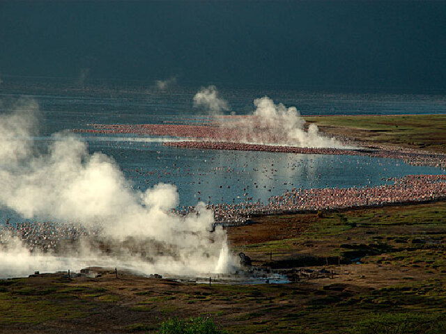 纳库鲁国家公园是专门为禽鸟建立的公园,纳库鲁湖以火烈鸟而闻名于世,因为这里位于火山带,所以湖水盐碱度较高,火烈鸟的主食——浮游生物刚好需要这样的生存条件。火烈鸟喜欢结群的特性使得湖面上时常会出现彩霞般绚丽的景象。
