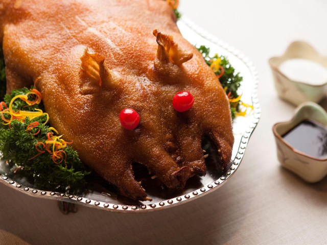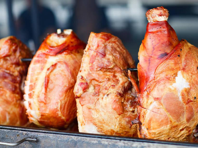 烤猪腿,将腌过的猪腿烤制酥脆,切成小块,淋上酱汁,搭配蒜蓉、胡椒、醋,香脆可口,味甘不腻。