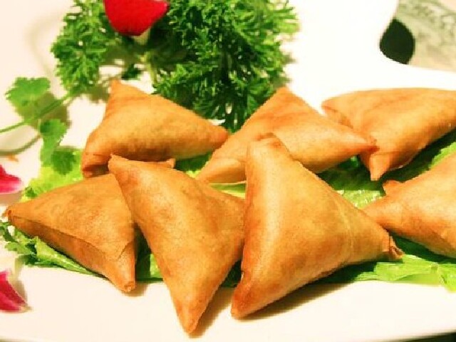 主要原料是面粉,配料是洋葱,肉沫,香料,咖喱粉,土豆泥等。将馅料混合拌匀包入擀好的面皮中捏成三角状,放油锅中炸制金黄即可。