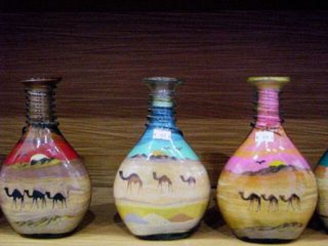 沙画瓶原来是阿拉伯游牧民族的民间艺术,他们发现把各色的沙子放在瓶子里摇晃,会形成沙漠风光般的彩画,长期身处色彩单调、荒凉沙漠的贝都因人,非常喜欢色彩艳丽的图案,就把沙画瓶作为礼物送给亲朋好友。开始都是摇晃沙子后形成的自然图纹,也不做固沙处理。至今,约旦只有30人依然从事这项艺术,可以称得上是约旦的国宝之一。
