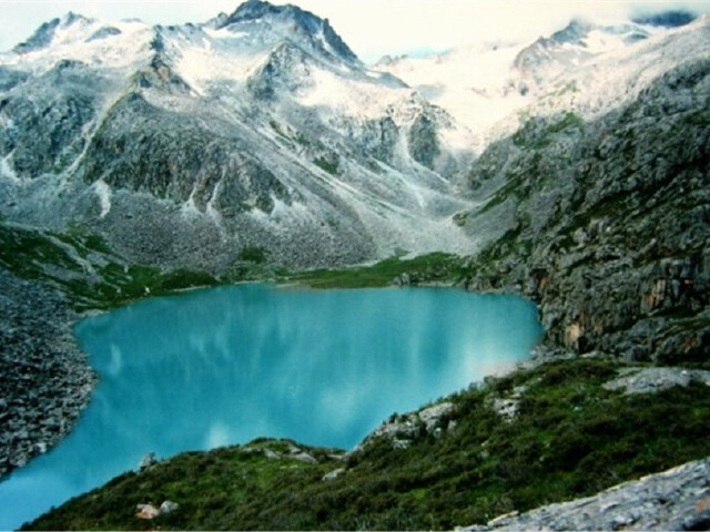 从高山杜鹃林出来,翻越过一道山脊,就会看到达古冰川东措日月海就静静的躺在面前,橄榄绿的碧波万顷,形状恰似一个哑铃。东措日月海长1500米,宽300余米。凝望着日月海,她就像温婉而深情的少女,用明亮恬静、含情默默的眼睛注视着你,令人怦然心动,光都会在这里停滞,声音都会在这里消失,偶尔山风拂过,湖面微波荡漾,才稍觉时间流逝。