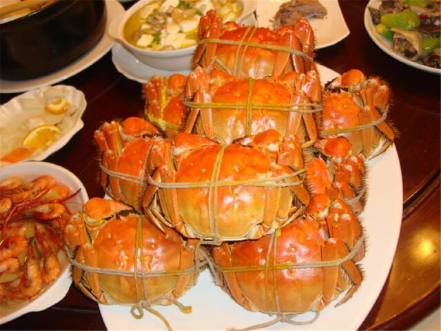 阳澄湖大闸蟹,背青、肚皮白、爪子金、毛色黄,个头大而强壮,煮后的外壳呈现亮橘红色,口感鲜甜。每只个头都在二两五以上的母蟹、三两五以上的公蟹通常清蒸或水煮的方法,个头较小的用来棉拖或酒呛为佳。因为螃蟹是寒性的,煮的时候要加生姜解寒还要用菊擦手接触腥味。讲究的食客还有专门的拆蟹工具,俗称的蟹八件。精敲细剥,回味无穷。