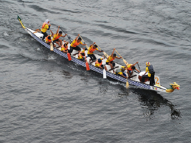 龙舟竞渡可说是博鳌端午节的高潮。龙舟长10米多,以龙头和龙尾作装饰,船身还特意雕上或画上麟状花纹,惟妙惟肖;每只龙舟可容纳20至22人,二人并肩而坐,在船首的鼓手和船尾的舵手引领下,借着有节奏的鼓点和围观人群的呐喊声一鼓作气划向终点。