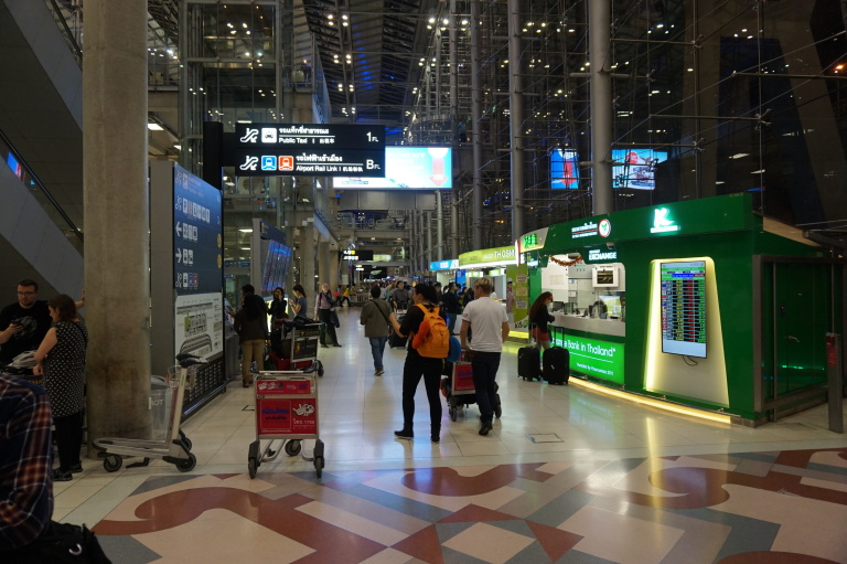 素万那普国际机场兑换泰铢是24小时服务的,在国际到达那里就有柜台,就在填写落地签申请表的那里。