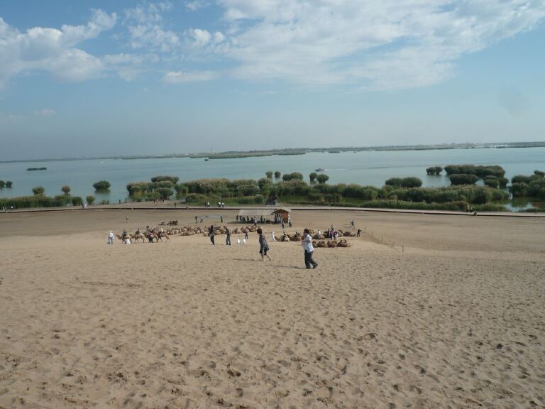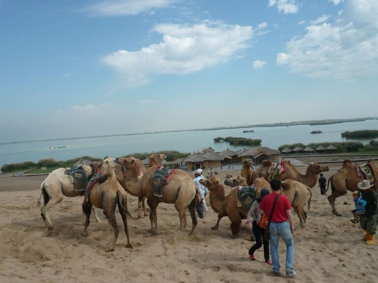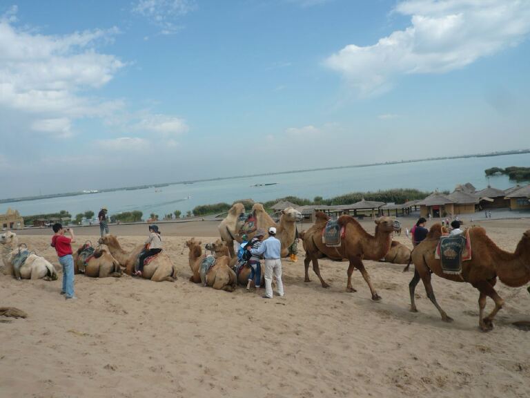 银川的沙坡头和沙湖景区都可以骑骆驼的,我去的是沙湖景区。沙湖地处石嘴山市与平罗县之间,是一处融江南水乡与大漠风光为一体的生态旅游景区,它是由北面的湖区和南边的沙漠区组成,以沙、水、苇、鸟、山五大景源有机结合,构成了独具特色的秀丽景观被人们称之为塞上明珠。