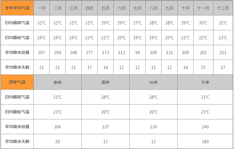 斐济气候属热带海洋性气候,全年冷热适中,气温一般保持22°C-32°C之间。5月至10月是斐济的“冬季”和干季,其间降水偏少,湿度低,气温较为温和,并且遇到类似飓风的极端天气状况的风险比较低;11月至次年4月是斐济的湿季,其中12月至次年4月中的降雨最多、湿度最大。前往斐济旅游应尽量避免当地的湿季,即11月至次年4月,避开多雨天气;5月至10月是斐济的干季,其间降水较少,气温温和,适宜前往旅游。