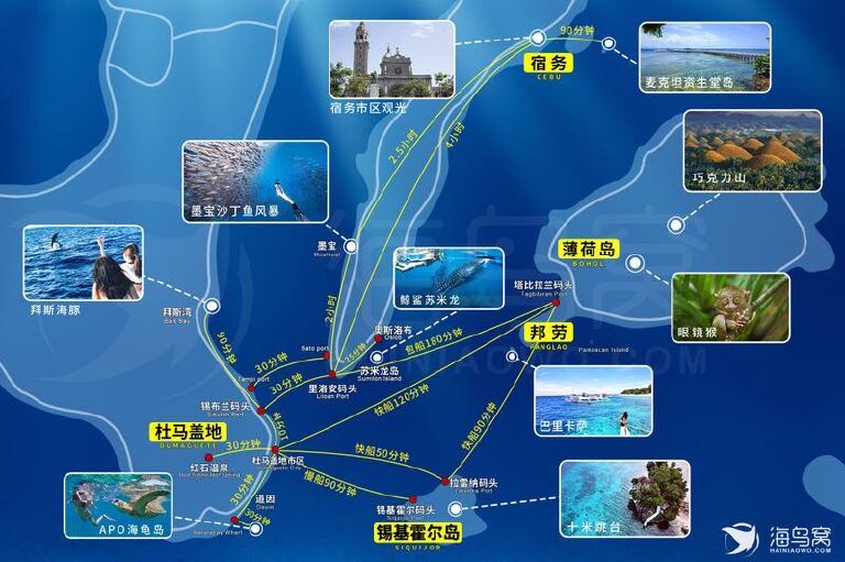 以下这张图应该会对你帮助很大,可以参考以下。我上次是从宿务机场直接去的奥斯洛布,先从机场打车到南站,再从南站坐巴士到奥斯洛布得小镇上,巴士要坐四个小时左右,要控制好时间。早上尽量早的坐Tutu去到观赏地,排队交钱,浮潜看的话是1000peso,不下水看的话500peso