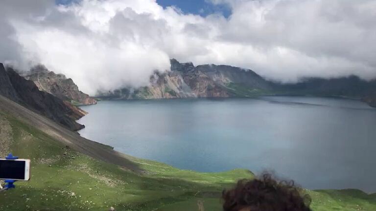 带老人或孩子上北坡看天池比较好。坐车上去后有A环线和B环线可选:A环线上人多要等排队放行,且要走一段斜坡梯子,但因地势更高更壮观;B环线上坡缓人相对少,也能看到天池,相比来说景色稍逊色些。