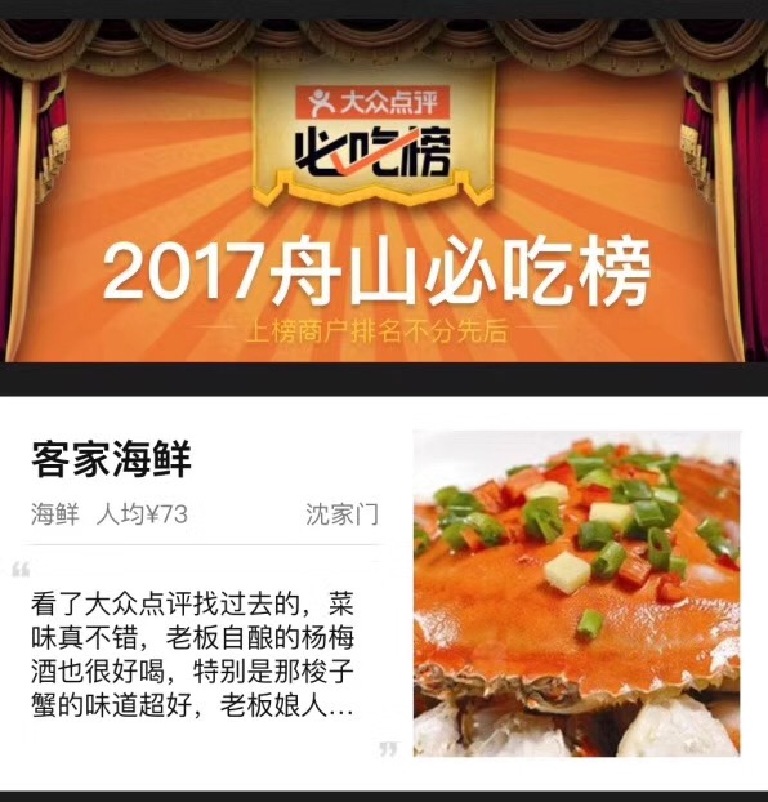 一般说来舟山就是吃海鲜,非常的新鲜,在特定日期吃的海鲜价格会便宜很多,比如现在梭子蟹很便宜。早餐可以吃海鲜面,本地人一般去老国强比较多,外地人跑见海海鲜面馆比较多,性价比还是蛮高的。正常可以尝尝客家海鲜~超级新鲜,味道一绝!夜宵可以去海鲜夜排挡,一条街,随便挑,我们吃的31号味道也是极好的。如果你吃腻了川菜,不妨去凯宏广场吃川菜,蜀媚娘家做的东西也是超级棒!