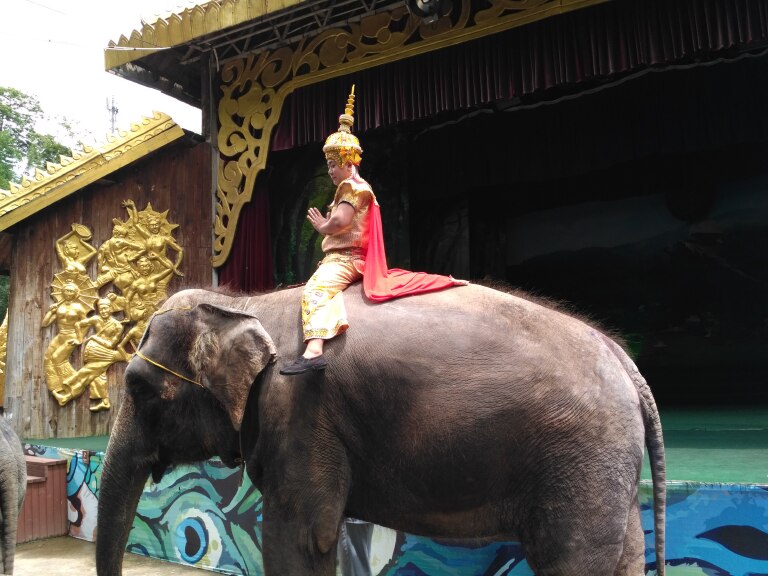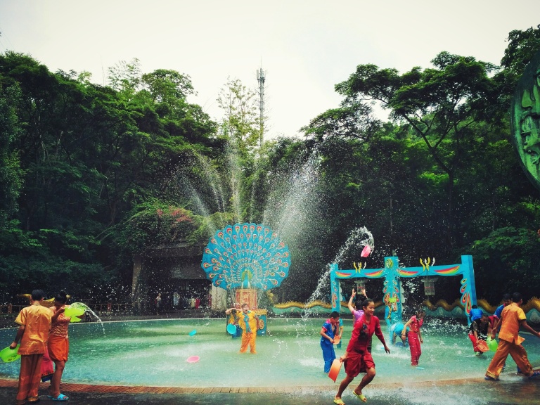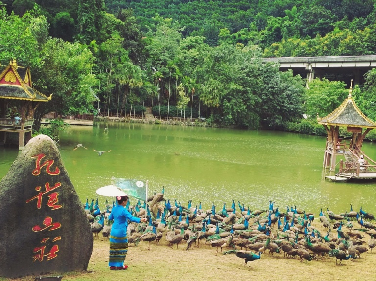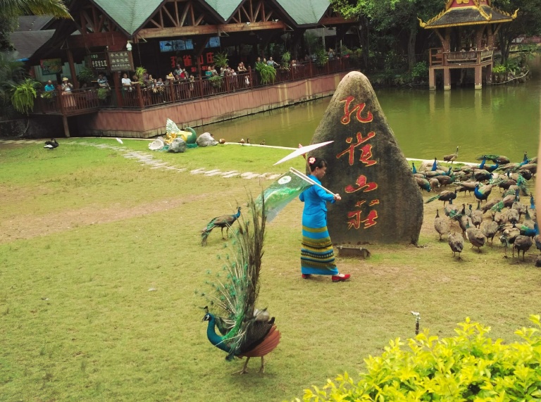 每个景区都有她的特点,有的碧海蓝天,有的青山绿水,有的鸟语花香,有的惊险刺激,要说哪个景点最有趣,我第一想到的就是西双版纳原始森林公园。森林公园有个孔雀山庄,每天定点放飞孔雀,开始时,几百只孔雀从对面山坡经过一片水塘飞过来,场面非常壮观,但在这里只停留十几分钟,孔雀女就吹口哨把孔雀赶到对岸,有的游客投食孔雀有美食也不愿回去,有的孔雀就开屏了,游客哗一下跟过去纷纷拍照,一会这边又有孔雀开屏了,游人又哗一下跑过来拍照留念。充满了欢乐,充满了奇趣。森林公园里还有个有趣的节目是歌舞、泼水表演,半个小时有十个少数民族的歌舞和乐器表演,真让人大开眼界,之后有两只大象缓缓走到舞台前,前腿跪下,有族长坐上象背,走向泼水现场,在泼水区,大象首先吸很多水然后喷向人群,以此宣布泼水开始,人们衣服湿噜噜的,脸上却充满欢乐、喜悦。