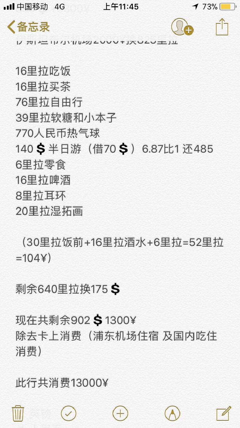 我是4月初的行程,还没到旺季,价格比较便宜,连热气球、安塔利亚出海、升级洞穴酒店,不算其他个人消费,8千元左右